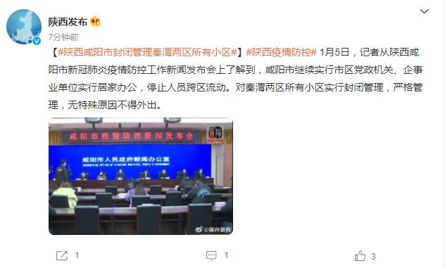 1月5日,从陕西咸阳市新冠肺炎疫情防控工作新闻发布会上了解到,咸阳市继续实行市区党政机关、企事业单位实行居家办公,停止人员跨区流动。对秦渭两区所有小区实行封闭管理,严格管理,无特殊原因不得外出。