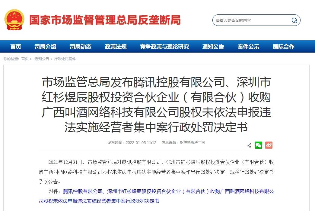 2021年12月31日,市场监管总局对腾讯控股有限公司与河南和谐汽车贸易有限公司设立合营企业未依法申报违法实施经营者集中案作出行政处罚决定,现将行政处罚决定书予以公告。