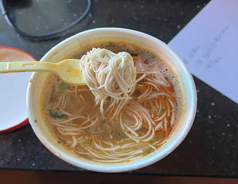 他从厨房里端出三桶热乎乎的青稞泡面。“记者老师,趁热,这路上能吃口热乎饭不容易。”那一瞬,我充满感动。我明白,青藏公路上,所有的食品、饮用水等物资都是长途配送过来的,一桶青稞泡面,也是“礼轻情意重”。我低下头,认真吃了起来。只觉得,香!