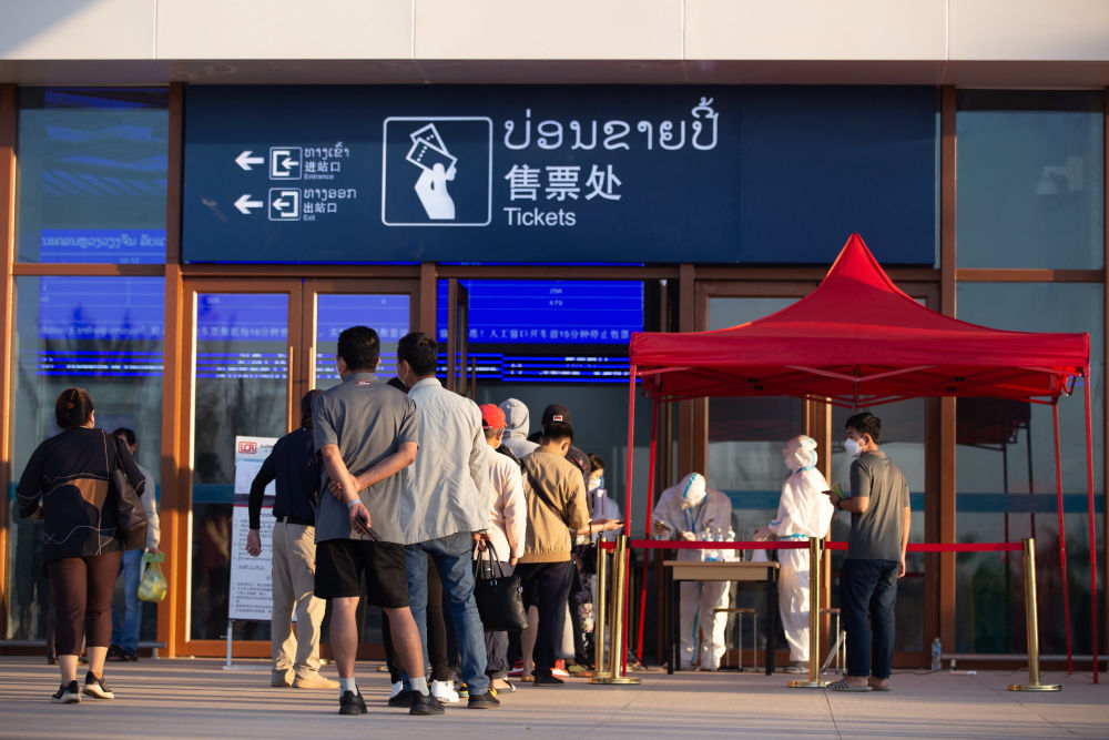 2021年12月12日,旅客在中老铁路万象站排队买票。(新华社记者章建华摄)