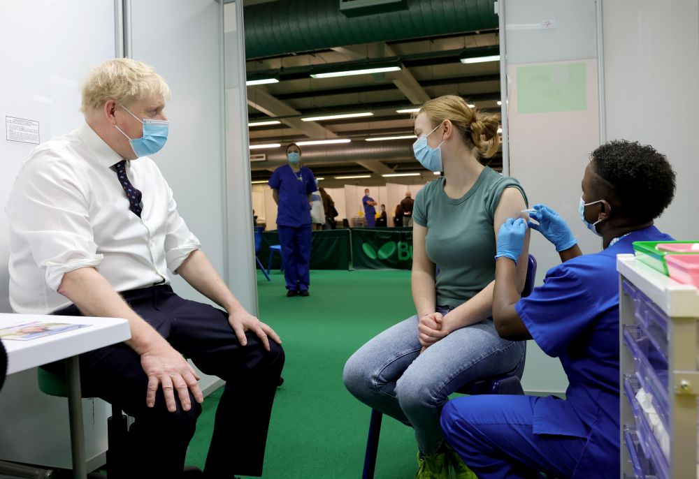 1月3日,英国首相约翰逊(左)在英国艾尔斯伯里参观一家新冠疫苗接种中心。新华社发(英国首相府供图)