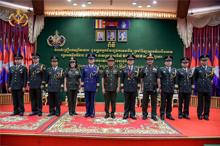 | 柬埔寨王家军在总司令部为中国人民解放军第十二批援柬院校专家组举行授勋仪式。中国驻柬使馆供图 |