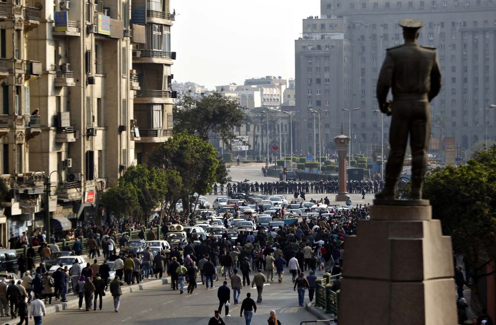 2011年1月25日,在埃及首都开罗,人们在街头游行时与警察对峙。新华社记者才扬摄