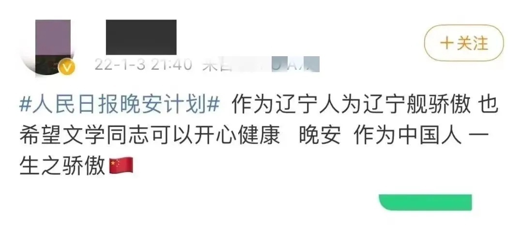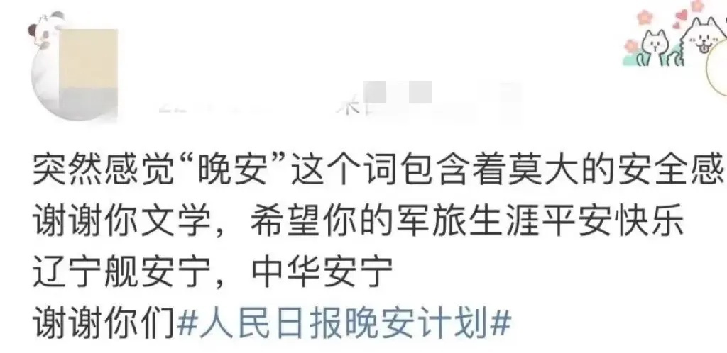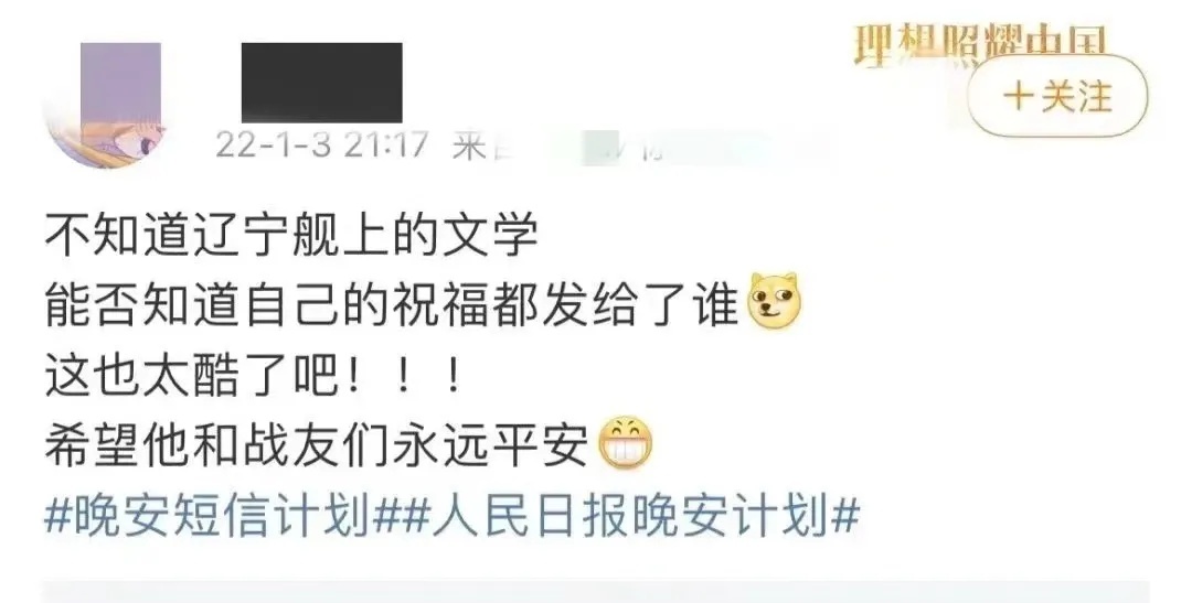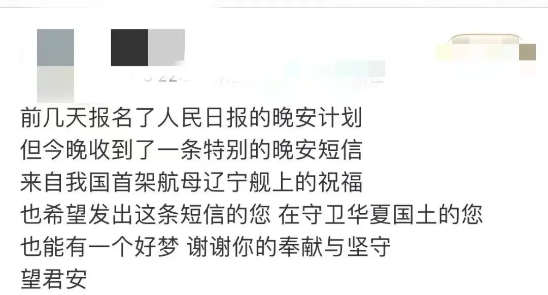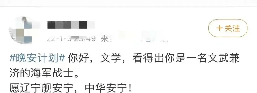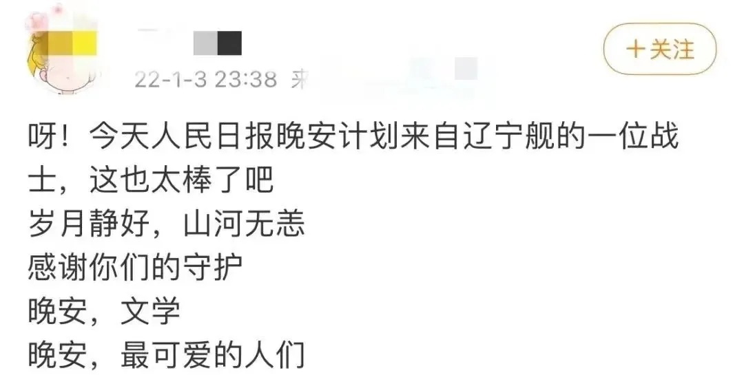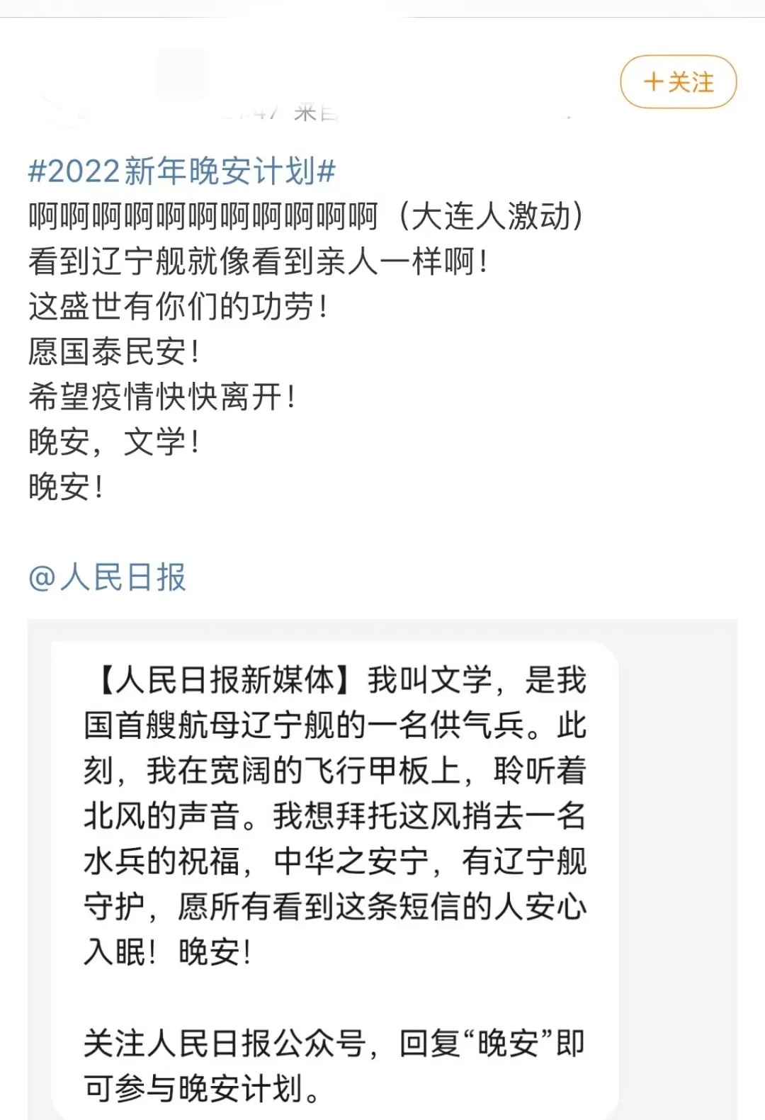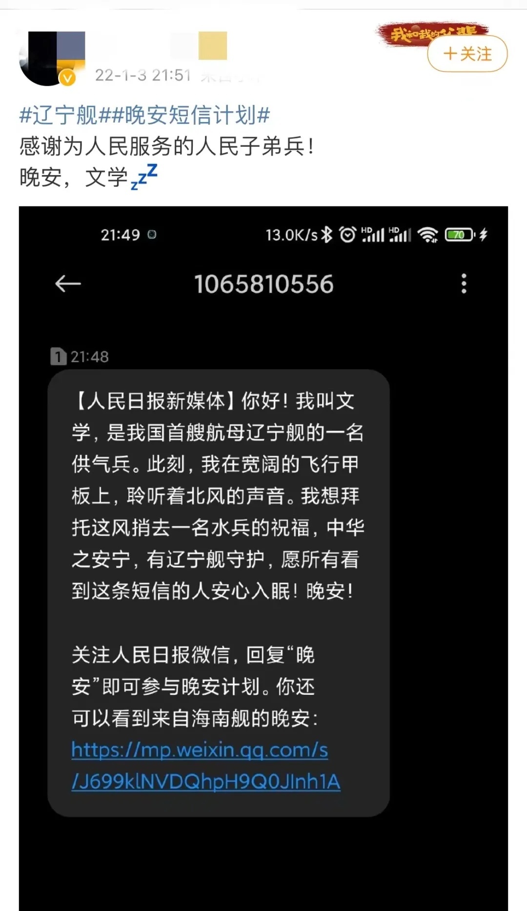 这是2022新年晚安计划活动中人民日报微信在1月3日晚发出的一条晚安短信,是我国首艘航母辽宁舰的一名供气兵文学所写,收到这条晚安短信后,许多网友都在和文学说晚安。