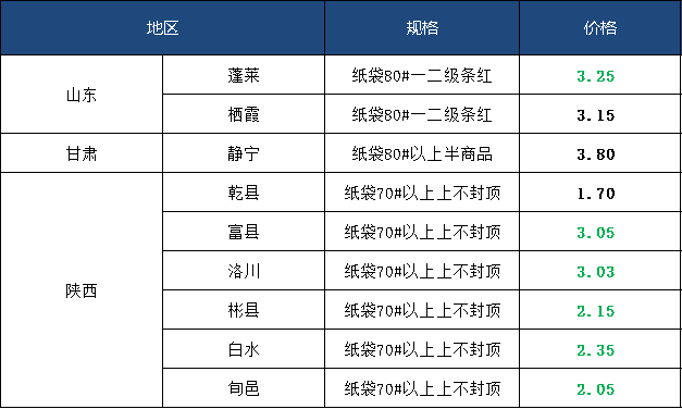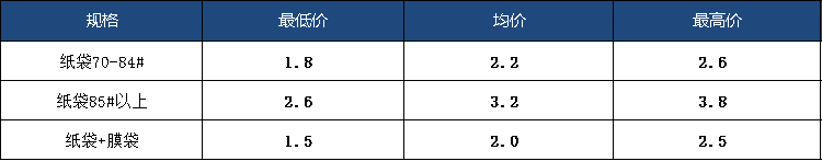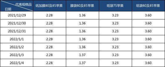 指数监测显示,截至1月4日,纸加膜80及85规格富士苹果均价为2.28元/斤,膜袋80及85规格富士苹果均价为1.37元/斤,纸袋75规格富士苹果均价为3.23元/斤,纸袋80及85规格富士苹果均价为3.60元/斤。