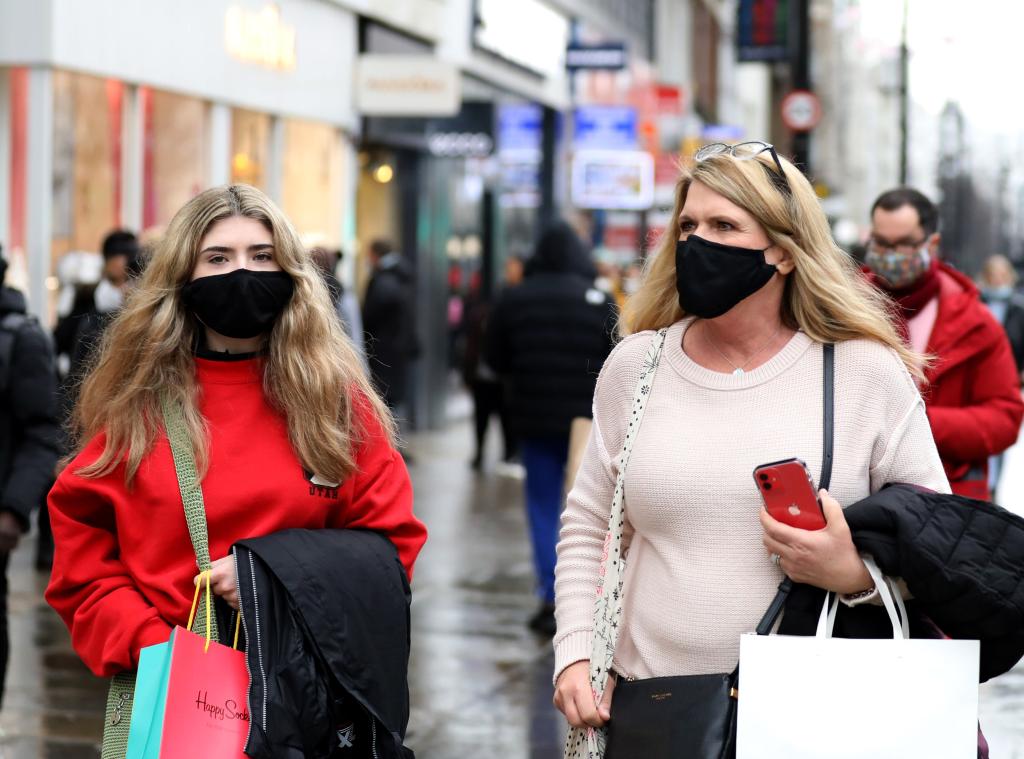2021年12月26日,人们手提购物袋走在英国伦敦的牛津街上。英国国民保健制度国家医疗事务主任史蒂文·波伊斯警告,随着奥密克戎毒株席卷全国,英国卫生服务已处于“战争状态”。(新华社记者李颖摄)