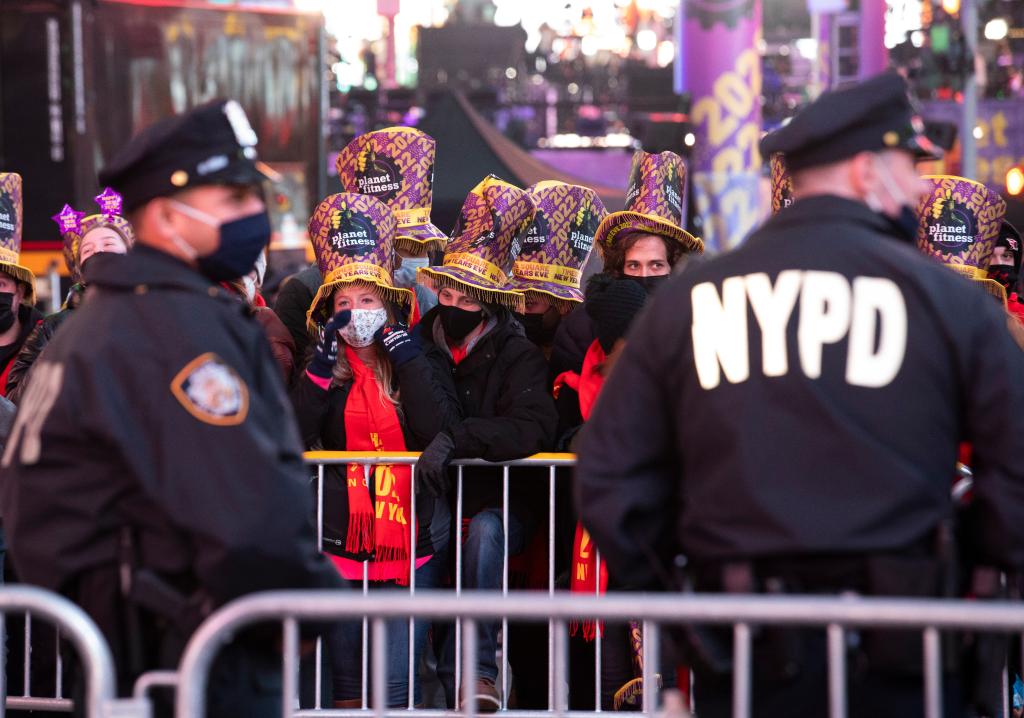 2021年12月31日,人们在美国纽约时报广场参加跨年庆祝活动。由于变异新冠病毒奥密克戎毒株近期造成确诊病例激增,纽约跨年庆祝活动的现场观众人数受到限制,且观众须遵守佩戴口罩、完全接种疫苗等防疫规定。(新华社记者王迎摄)