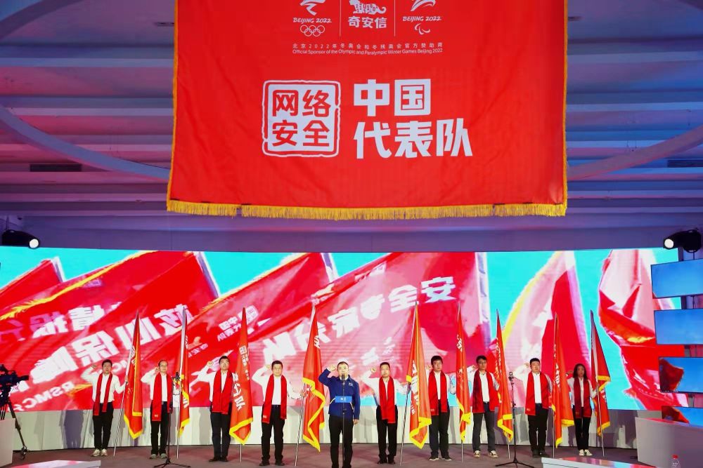 当日,奇安信冬奥保障团队各分队总队长分别从齐向东手中接过战旗,并和冬奥各竞赛和非竞赛场馆、多个监控保障中心的驻场网络安全保障团队,以及全国各分支机构代表共同宣誓:“我们是网络安全中国代表队,我们宣誓——共同守卫北京冬奥,坚决捍卫网络安全;我们必将听从指挥,坚守岗位,争分夺秒,团结协作,为北京举办一届安全的科技冬奥盛会,贡献力量!”