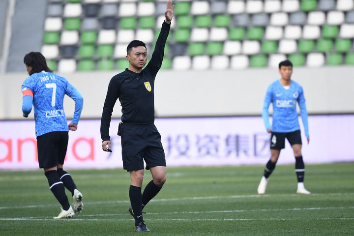 2021年12月28日,在中超联赛第20轮(第二阶段)保级组比赛中,主裁判唐顺齐(中)依据视频助理裁判反馈判罚大连人队进球越位在先无效。新华社记者 黄博涵 摄