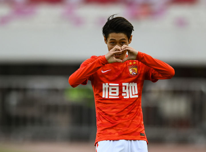 1月1日,在中超联赛第21轮(第二阶段)争冠组比赛中,广州队以2比0战胜长春亚泰队,广州队球员谭凯元在进球后庆祝。新华社记者 王曦 摄