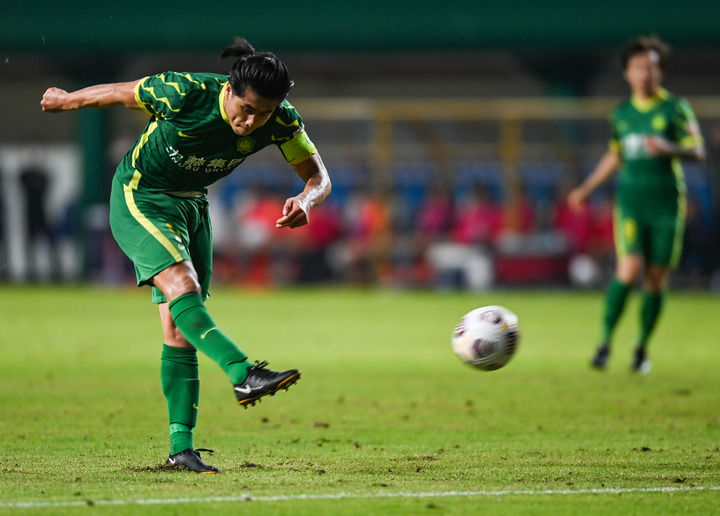 2021年12月22日,在中超联赛第18轮(第二阶段)争冠组比赛中,北京国安队以2比2战平深圳队。北京国安队球员张玉宁(左)在比赛中射门。新华社记者 王曦 摄