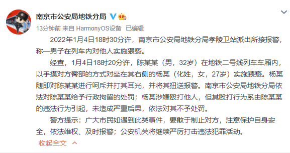 1月5日,南京市公安局地铁分局官方微博发布通报:2022年1月4日18时30分许,南京市公安局地铁分局孝陵卫站派出所接报警,称一男子在列车内对他人实施猥亵。