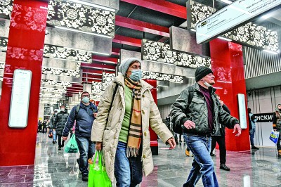 2021年12月7日,由中国铁建承建的莫斯科地铁第三换乘环线西南段投入运行。图为乘客走在红色立柱、团寿纹、祥云等中国元素随处可见的米丘林大街站内。新华社发