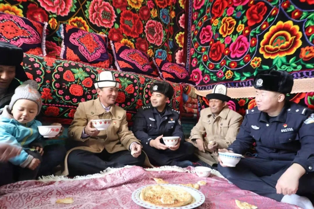 移民管理警察走访阿布都加帕尔(左三)家