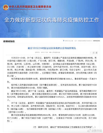 截至1月5日24时,据31个省(自治区、直辖市)和新疆生产建设兵团报告,现有确诊病例3282例(其中重症病例30例),累计治愈出院病例95203例,累计死亡病例4636例,累计报告确诊病例103121例,现有疑似病例2例。累计追踪到密切接触者1441120人,尚在医学观察的密切接触者41619人。