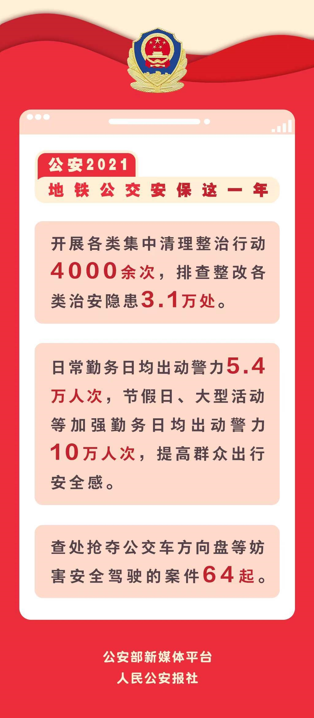2021年,各地公安机关地铁公交安保部门深入开展“我为群众办实事”实践活动,紧密围绕影响群众反映强烈的公共交通出行安全问题,积极开展地铁公交及周边风险隐患专项排查整治,全面加强地铁公交安全防控能力,确保人民群众安全便捷出行。