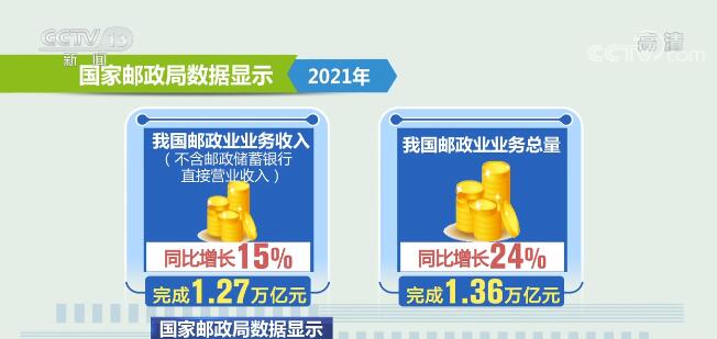 国家邮政局数据显示,2021年我国邮政业业务收入(不含邮政储蓄银行直接营业收入)和业务总量分别完成1.27万亿元和1.36万亿元,同比分别增长15%和24%;快递业务收入和业务量分别完成1.04万亿元和1085亿件,同比分别增长18%和30%。新增社会就业20万人以上,支撑网络零售额接近11万亿元。