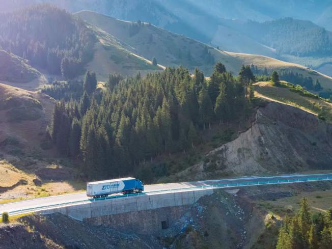 中通快递高运力牵引车行驶在新疆伊犁地区的国道上。张毅摄