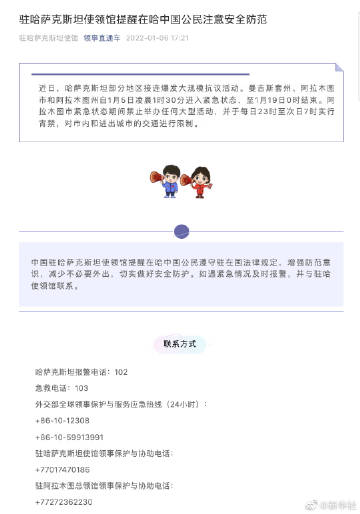 【#驻哈萨克斯坦使领馆提醒在哈中国公民注意安全防范#】据外交部“领事直通车”微信公众号消息,近日,哈萨克斯坦部分地区接连爆发大规模抗议活动。曼吉斯套州、阿拉木图市和阿拉木图州自1月5日凌晨1时30分进入紧急状态,至1月19日0时结束。阿拉木图市紧急状态期间禁止举办任何大型活动,并于每日23时至次日7时实行宵禁,对市内和进出城市的交通进行限制。中国驻哈萨克斯坦使领馆提醒在哈中国公民遵守驻在国法律规定,增强防范意识,减少不必要外出,切实做好安全防护。如遇紧急情况及时报警,并与驻哈使领馆联系。