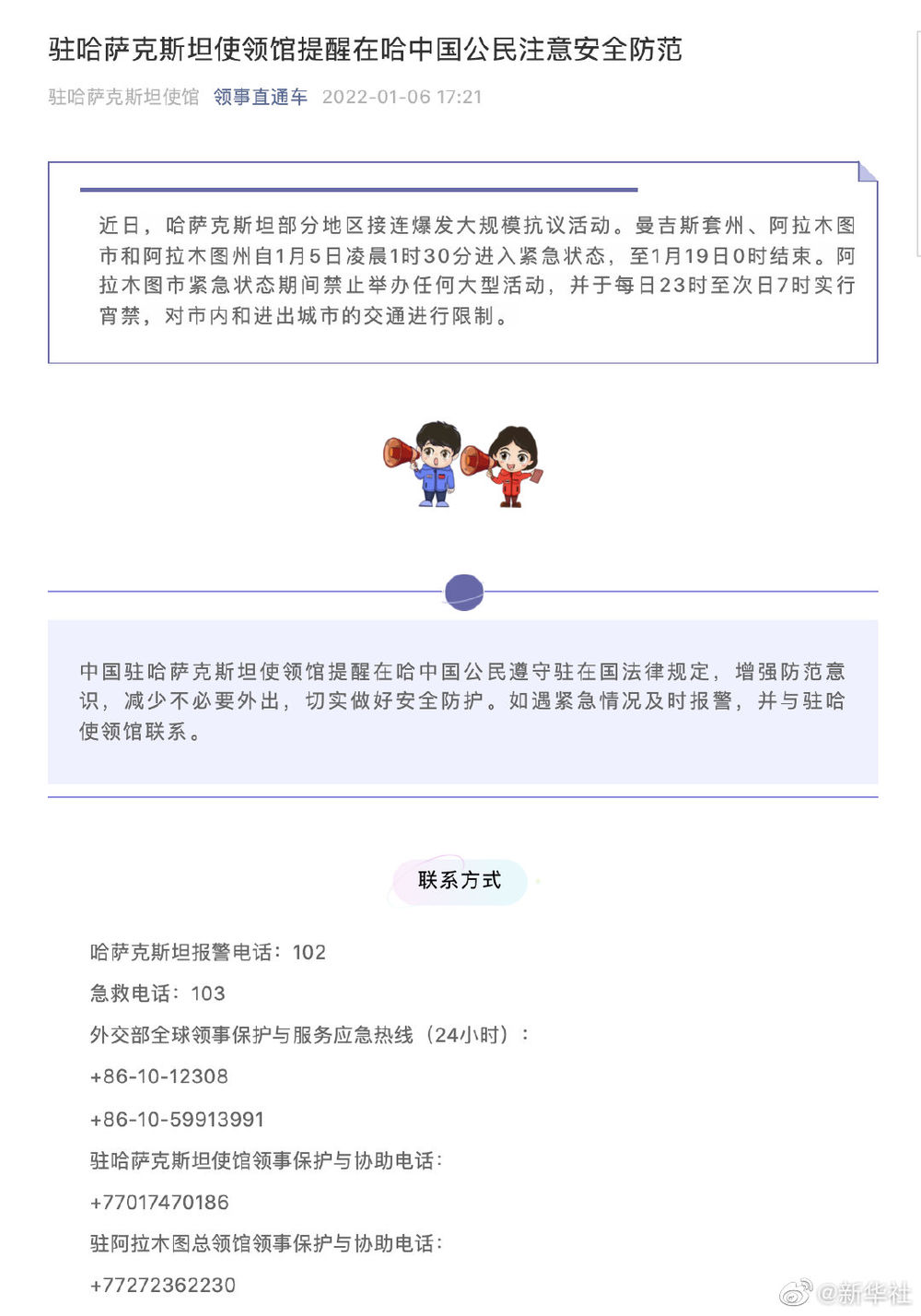 据外交部“领事直通车”微信公众号消息,近日,哈萨克斯坦部分地区接连爆发大规模抗议活动。曼吉斯套州、阿拉木图市和阿拉木图州自1月5日凌晨1时30分进入紧急状态,至1月19日0时结束。阿拉木图市紧急状态期间禁止举办任何大型活动,并于每日23时至次日7时实行宵禁,对市内和进出城市的交通进行限制。中国驻哈萨克斯坦使领馆提醒在哈中国公民遵守驻在国法律规定,增强防范意识,减少不必要外出,切实做好安全防护。如遇紧急情况及时报警,并与驻哈使领馆联系。详情>>