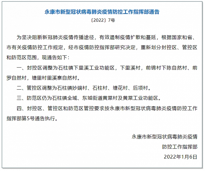 一、封控区调整为石柱镇下里溪工业功能区,下里溪村,前锦村下陈自然村、前罗自然村,塘里村里溪寨自然村。