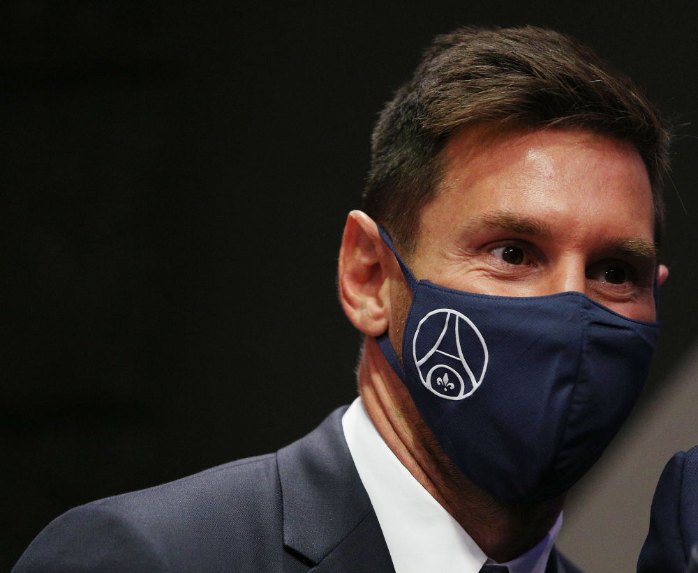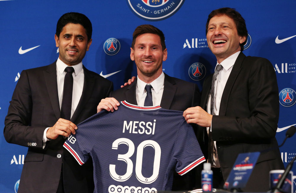 ↑2021年8月11日,梅西(中)在新闻发布会上展示球衣。当日,阿根廷前锋梅西加盟巴黎圣日耳曼俱乐部新闻发布会在巴黎举行。双方签约两年,并包含第三年的续约选项,梅西将身披30号球衣代表“大巴黎”出战。