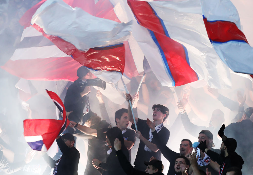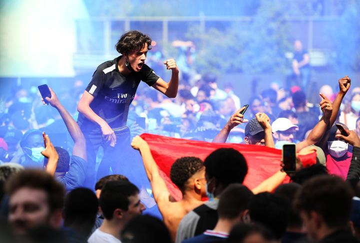 ↑2021年9月28日,巴黎圣日耳曼队球迷在现场欢呼。当日,在2021-2022赛季欧洲足球冠军联赛小组赛A组第二轮比赛中,巴黎圣日耳曼队主场以2比0击败曼彻斯特城队。