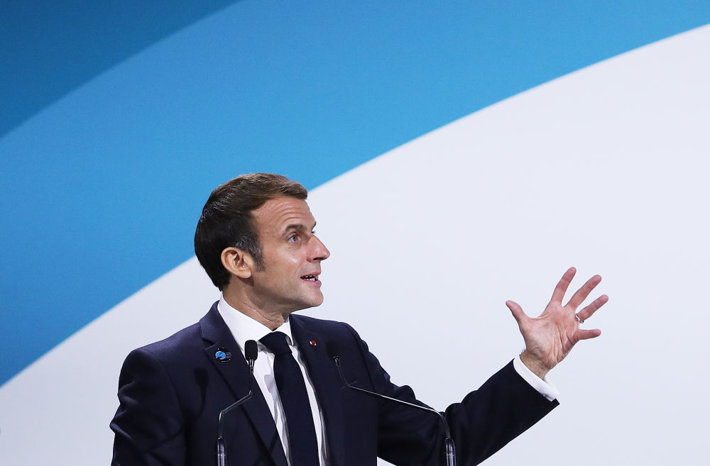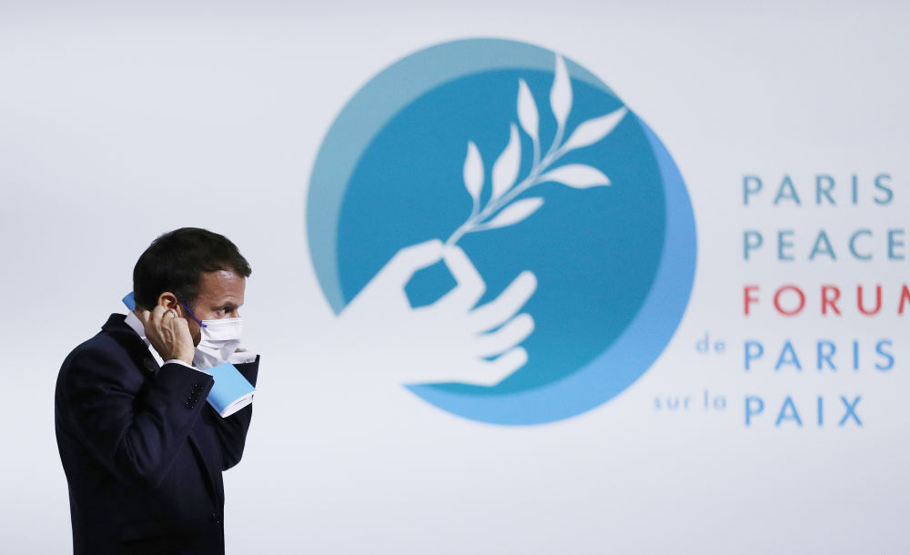 ↑2021年11月11日,在法国巴黎,法国总统马克龙在巴黎和平论坛上致辞。