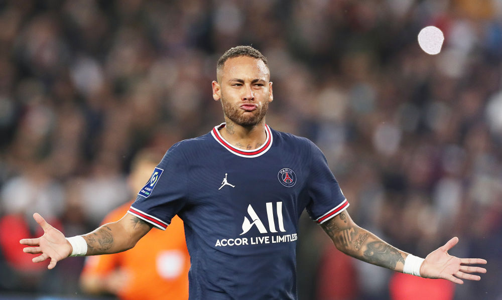 ↑2021年9月19日,巴黎圣日耳曼队球员内马尔在比赛中。当日,在2021-2022赛季法国足球甲级联赛第六轮比赛中,巴黎圣日耳曼队主场以2比1胜里昂队。