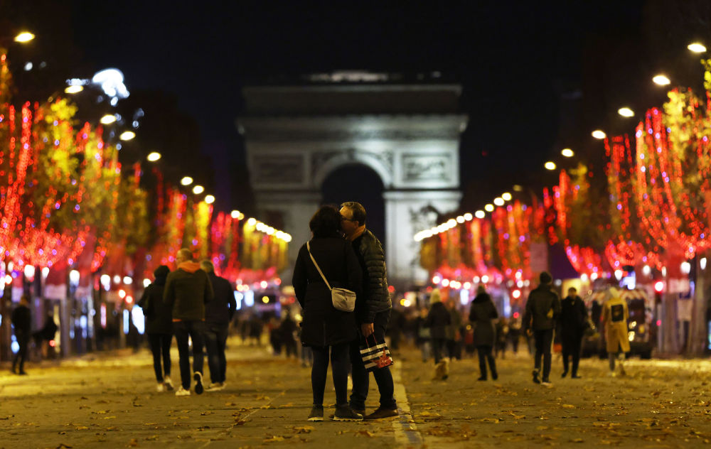 ↑2021年11月21日,一对夫妇在点灯后的法国巴黎香榭丽舍大街上拥吻。当日,法国巴黎著名的香榭丽舍大街迎来一年一度的点灯仪式。