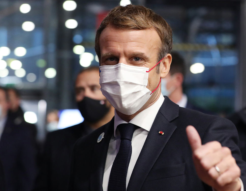 ↑2021年11月11日,在法国巴黎,法国总统马克龙在巴黎和平论坛上致辞后戴上口罩。