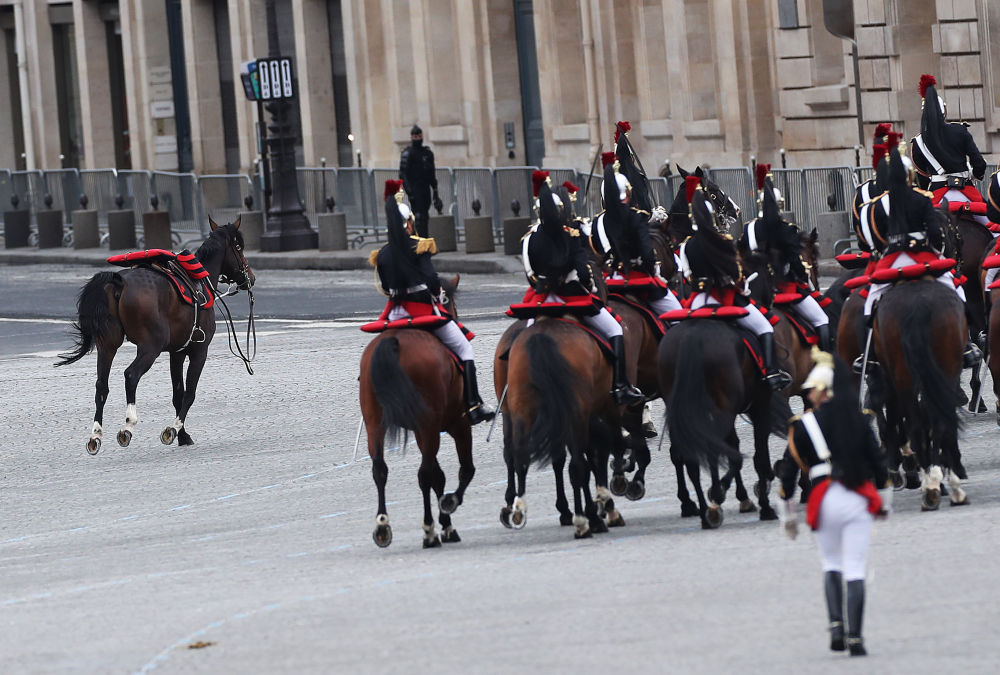 ↑2021年7月14日,在法国巴黎举行的法国国庆阅兵式上,骑兵队伍中的马匹甩下骑手独自跑开。