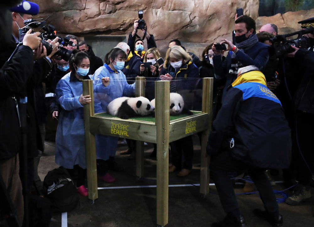 ↑2021年11月18日,在法国中部圣艾尼昂市博瓦勒野生动物园熊猫馆,来自中国四川成都的保育员将大熊猫双胞胎宝宝送到命名仪式现场。3个多月前在博瓦勒野生动物园出生的雌性大熊猫双胞胎18日分别喜获中文名“欢黎黎”和“圆嘟嘟”,寓意中法友谊和健康成长。
