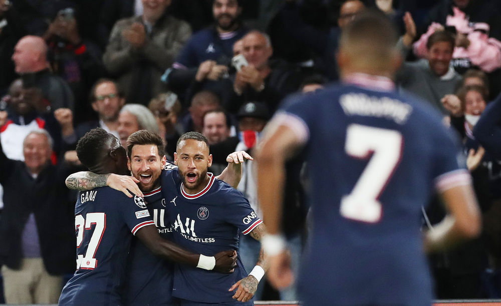 ↑2021年9月28日,巴黎圣日耳曼队球员梅西(左二)与内马尔(左三)、姆巴佩(右一)庆祝进球。当日,在2021-2022赛季欧洲足球冠军联赛小组赛A组第二轮比赛中,巴黎圣日耳曼队主场以2比0击败曼彻斯特城队。