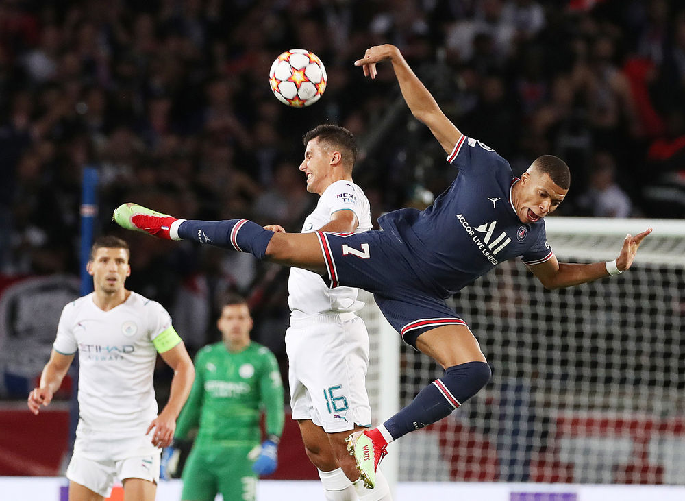↑2021年9月28日,巴黎圣日耳曼队球员姆巴佩(右)在比赛中拼抢。当日,在2021-2022赛季欧洲足球冠军联赛小组赛A组第二轮比赛中,巴黎圣日耳曼队主场以2比0击败曼彻斯特城队。