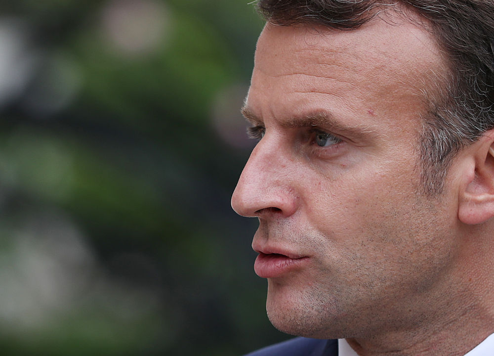 ↑2021年6月23日,法国总统马克龙在巴黎总统府爱丽舍宫与欧盟委员会主席冯德莱恩(不在画面中)出席新闻发布会。