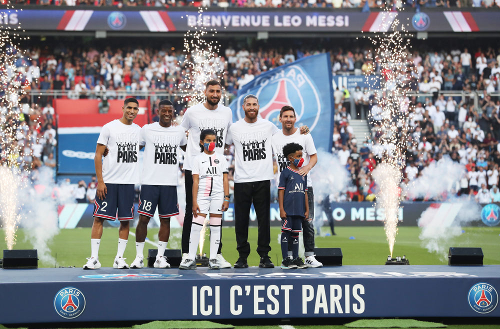↑2021年8月14日,巴黎圣日耳曼队在主场为今夏加盟球队的5名新援举行了一个简短的集体亮相仪式,梅西、拉莫斯、维纳尔杜姆、阿什拉夫和多纳鲁马5名球员身穿印有“我们是巴黎”字样的T恤,在王子公园球场接受5万名现场球迷的欢呼。