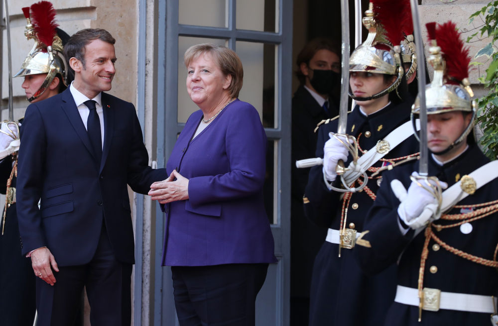 ↑2021年11月12日,在位于法国巴黎的峰会会场,法国总统马克龙欢迎德国总理默克尔。利比亚问题国际会议12日在法国首都巴黎举行。