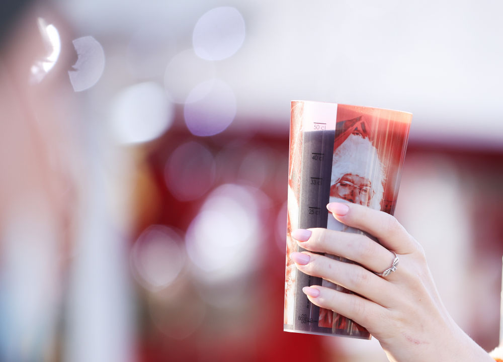 ↑2021年12月9日,在法国巴黎杜伊勒里花园的圣诞市场,一名女子举着圣诞市场的经典传统美食——热红酒。