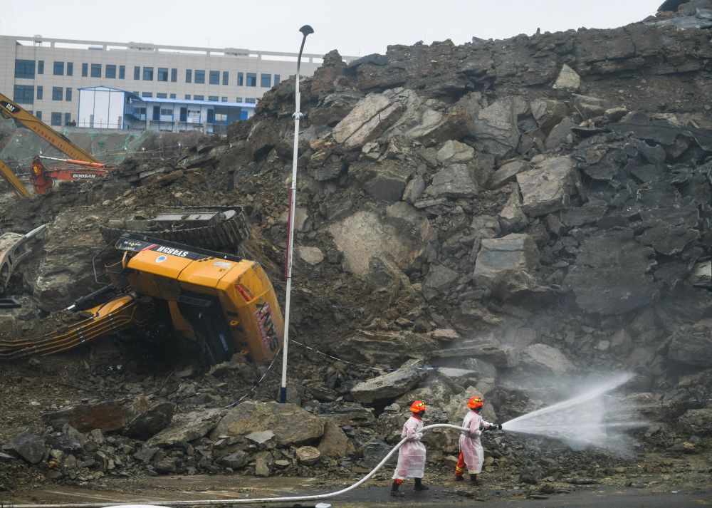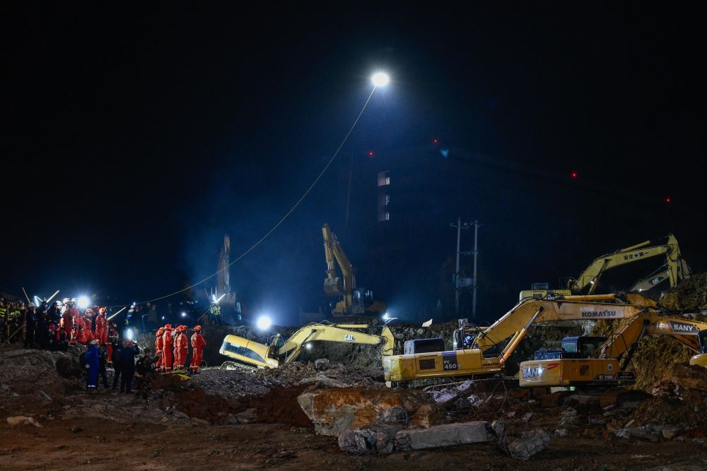午夜的事发现场被救援的灯火照得如同白昼。武警、消防、公安、医疗、应急、通信等部门人员均已到达现场,三名在工地开挖掘机和渣土车的被困司机已被第一时间救出,送往医院救治。