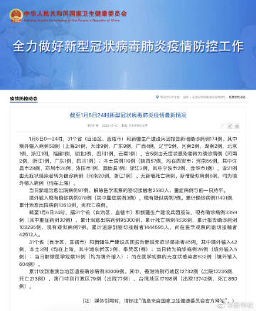 截至1月6日24时,据31个省(自治区、直辖市)和新疆生产建设兵团报告,现有确诊病例3359例(其中重症病例30例),累计治愈出院病例95300例,累计死亡病例4636例,累计报告确诊病例103295例,现有疑似病例7例。累计追踪到密切接触者1444595人,尚在医学观察的密切接触者42512人。