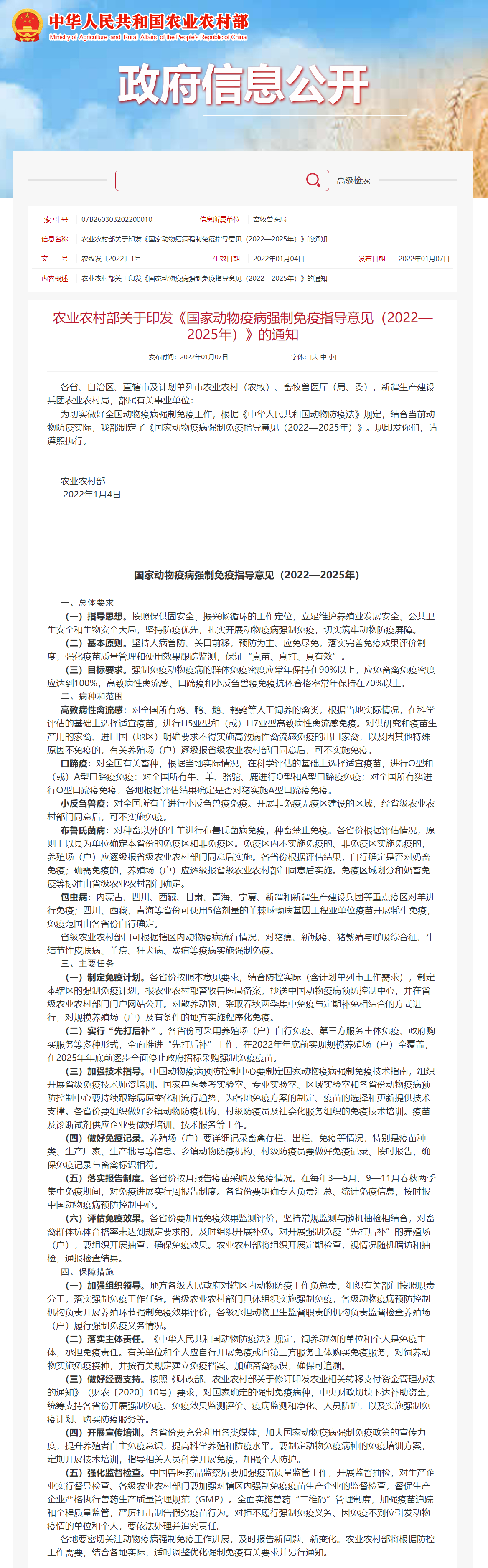 央视网消息:农业农村部今日(1月7日)印发《国家动物疫病强制免疫指导意见(2022—2025年)》提出,强制免疫动物疫病的群体免疫密度应常年保持在90%以上,应免畜禽免疫密度应达到100%,高致病性禽流感、口蹄疫和小反刍兽疫免疫抗体合格率常年保持在70%以上。