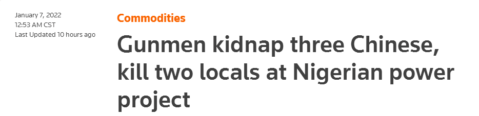 路透社消息,当地警方6日表示,武装人员在尼日利亚中部尼日尔州绑架了在一个电力项目工作的3名中国公民,并杀害了两名当地工作人员。