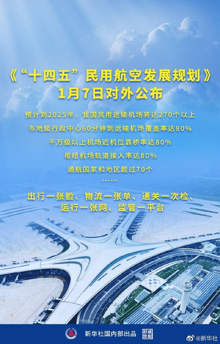 【#权威快报# | “十四五”#航空出行新图景出炉#】旅客刷脸出行、行李“门到门”、 不同交通方式换乘只需一次安检……日前,民航局、国家发展改革委、交通运输部联合印发《“十四五”民用航空发展规划》,预计到2025年,民用运输机场将达270个以上,千万级以上机场近机位靠桥率达80%,枢纽机场轨道接入率达80%,描绘出“十四五”期间航空出行的新图景↓(记者周圆,海报设计杨轶群)