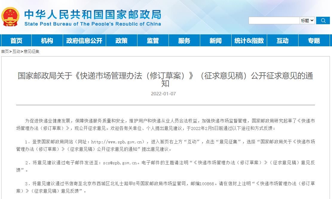 央视网消息:1月7日,国家邮政局发布关于《快递市场管理办法(修订草案)》(征求意见稿)公开征求意见的通知。征求意见稿提到,经营快递业务的企业未经用户同意,不得代为确认收到快件,不得擅自将快件投递到智能快递箱、快递服务站等快递末端服务设施。