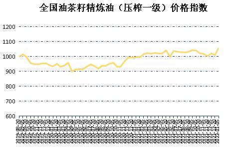截至2022年1月5日,全国油茶籽精炼油(压榨一级)价格指数报1058.59点,较上一统计日(2021年12月20日)1010.81点上涨47.78点,涨幅4.73%,指数较上期小幅上涨;指数较基期上涨58.59点,涨幅5.86%。