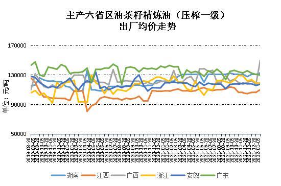 数据显示,2021年12月下半月,全国各重点省区油茶生产加工企业油茶籽精炼油(压榨一级)出厂均价较12月上半月多呈现上涨趋势。其中,湖南、江西、安徽三省重点企业油茶籽精炼油(压榨一级)出厂均价较12月上半月分别上涨1.47%、3.30%和1.39%;广西壮族自治区重点企业油茶籽精炼油(压榨一级)出厂均价较12月上半月明显上涨,涨幅达28.02%,调研显示,本期广西油茶籽精炼油(压榨一级)产品价格的上涨主要因个别企业礼品订单及企业订单量集中加大,产品价格附加值增多。浙江、广东两省重点企业油茶籽精炼油(压榨一级)出厂均价较12月上半月微幅下行,跌幅分别为0.52%和0.59%。