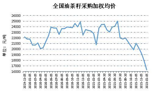 从全国市场看,各省区油茶龙头企业持续加强油茶籽采购,丰产背景下市场油茶籽货源充裕,企业可选择性增多,因收购议价油茶籽采购价格继续下行。截至2022年1月5日,含油率在25%以上的油茶籽采购均价为16298.08元/吨。