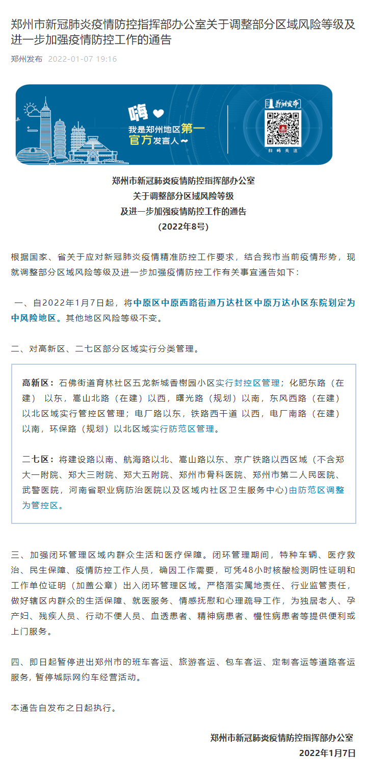 郑州市新冠肺炎疫情防控指挥部办公室1月7日发布通告称,根据国家、河南省关于应对新冠肺炎疫情精准防控工作要求,结合郑州市当前疫情形势,现就调整部分区域风险等级及进一步加强疫情防控工作有关事宜通告如下: