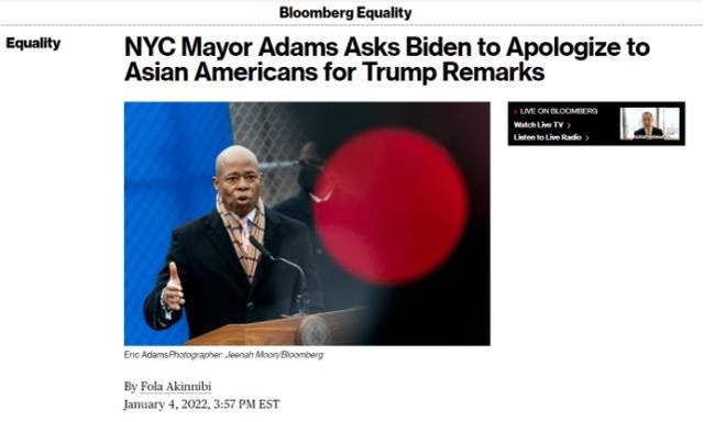 据彭博社报道,美国纽约市新任市长埃里克·亚当斯4日在记者会上表示,美国前任总统特朗普的“中国病毒”等言论伤害了美国的华人,现在的总统应该向华人社区道歉。